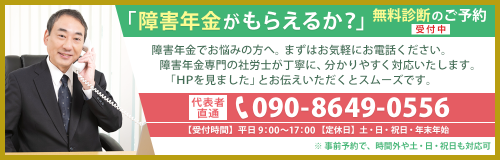 この無料相談では、日常生活状況等について詳細なヒアリングを行い、障害年金受給の具体的な見込みをお示ししたり、当事務所のサポート内容について説明します。