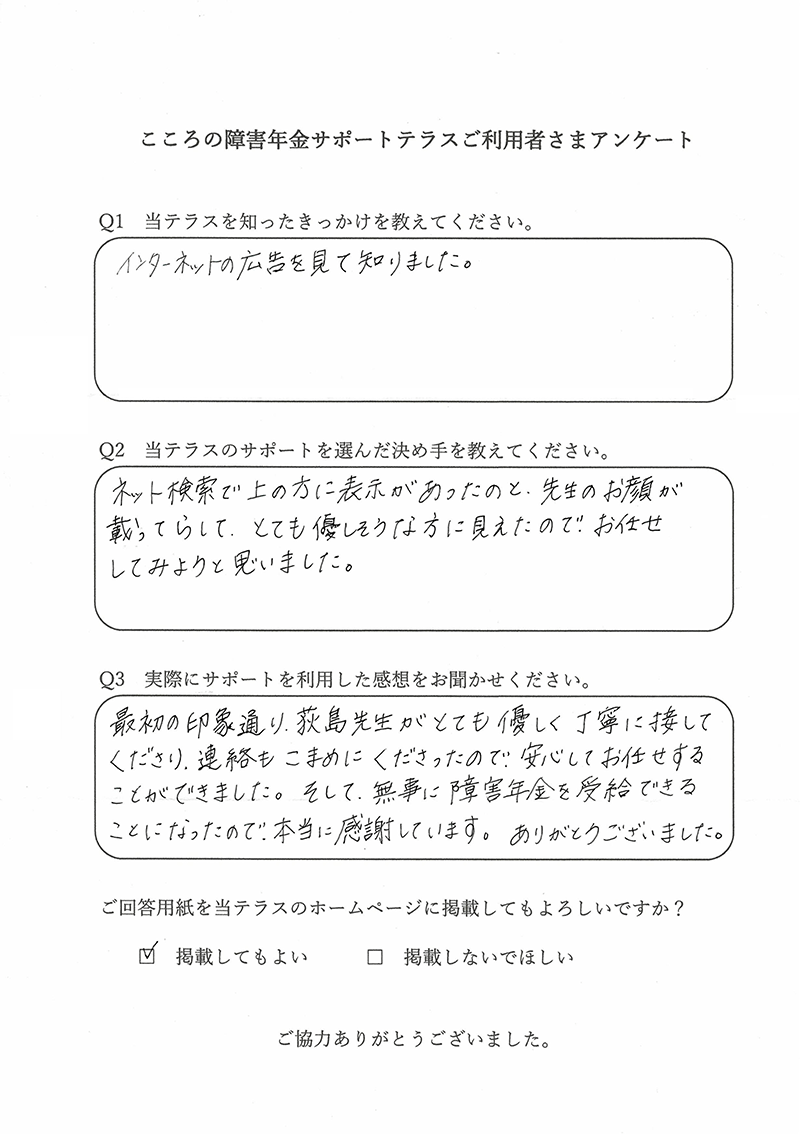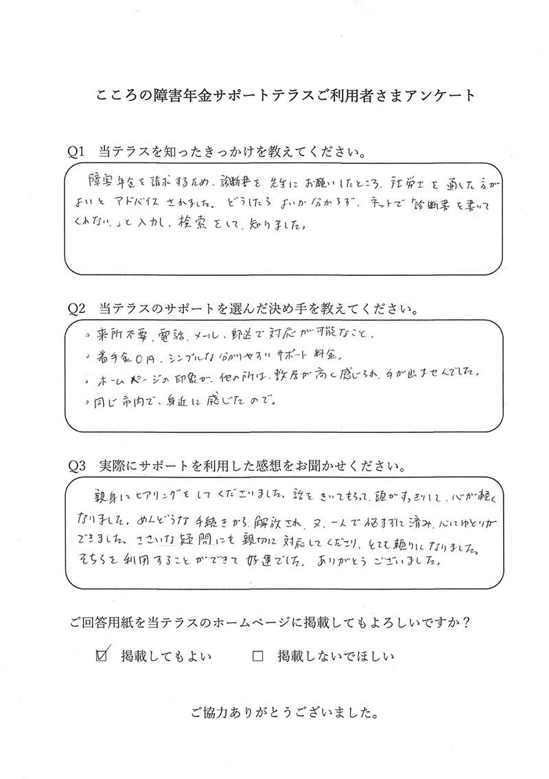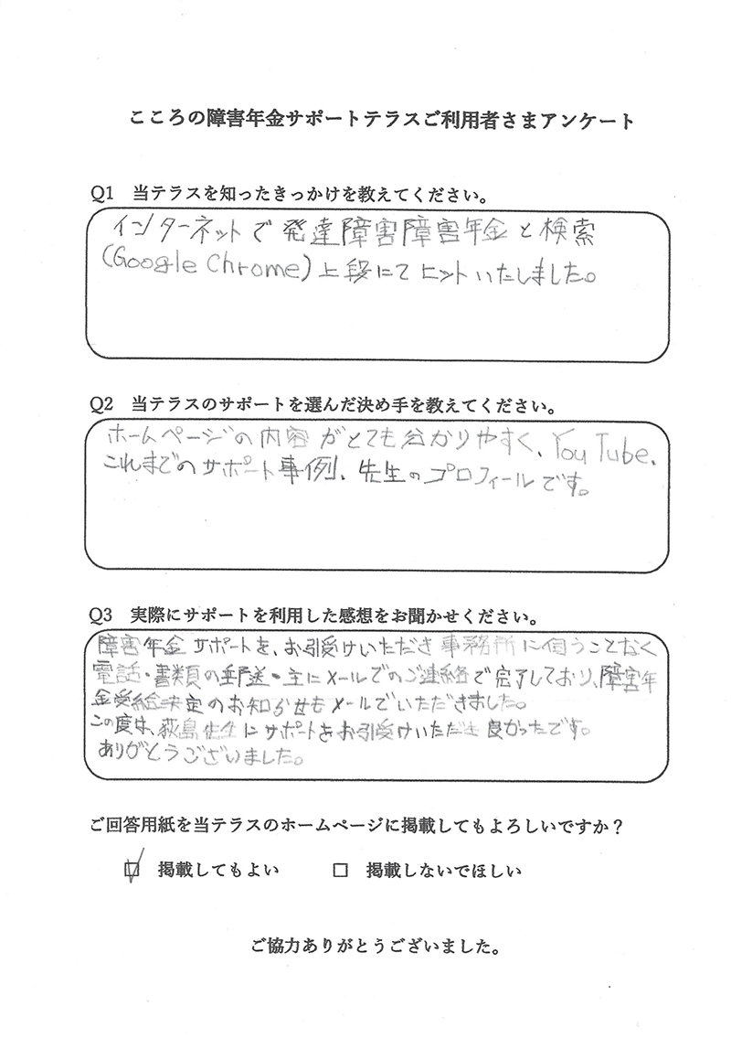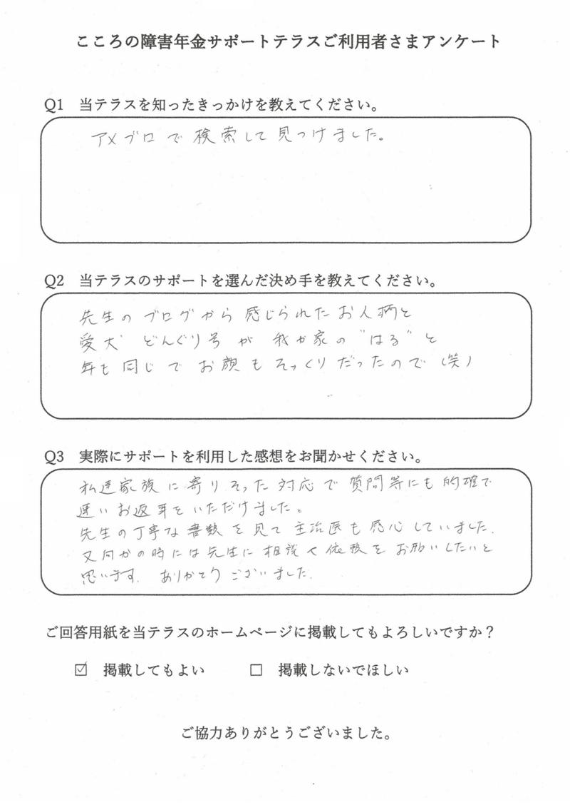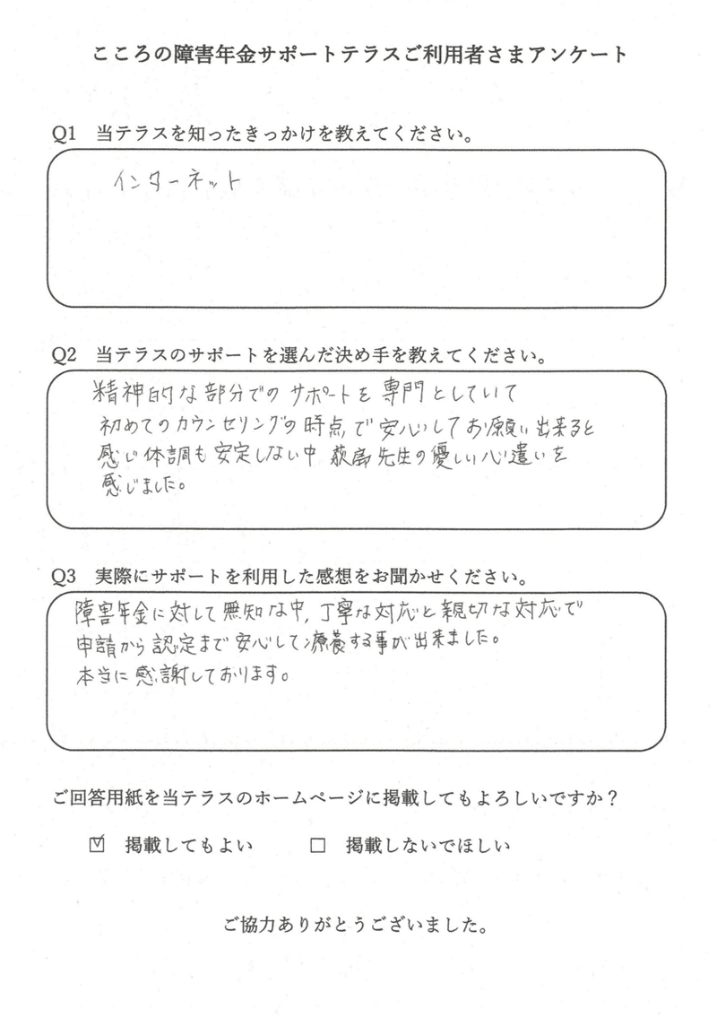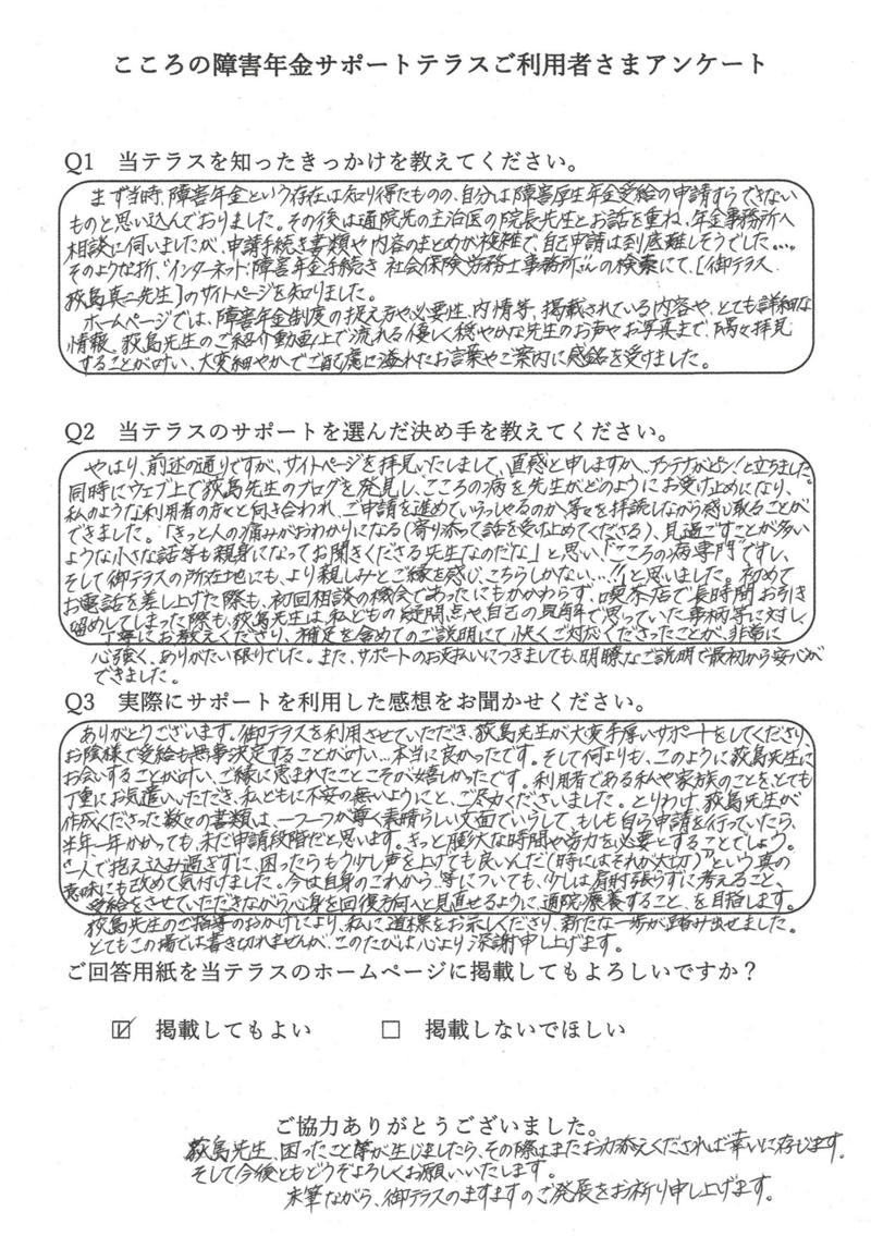 申込者様から「障害年金の支給決定通知が届きました」とご報告いただけたときに、この仕事をしていてよかったと感じます。 |